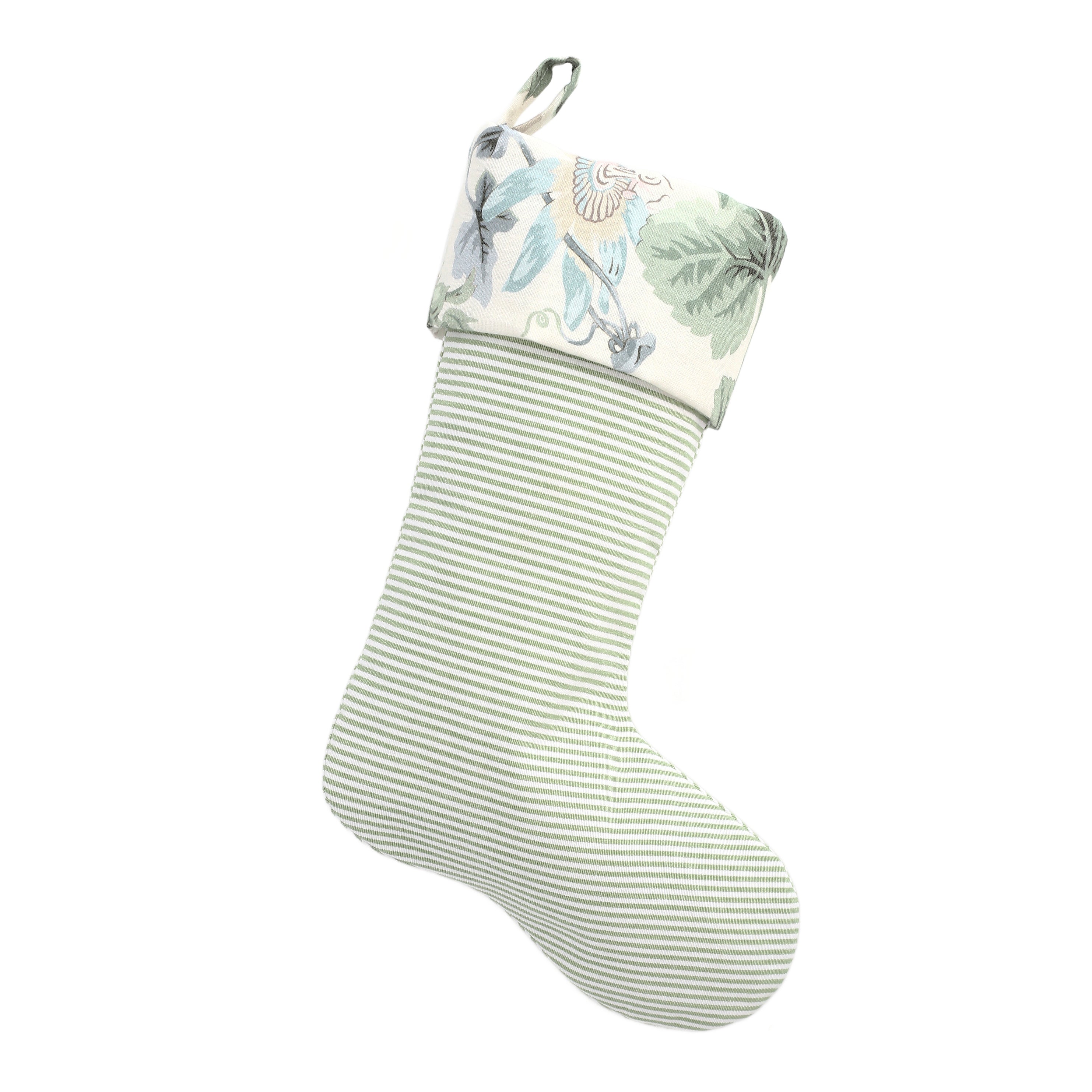 This style features our fern green ticking stripe on both sides, topped with a cuff in Scalamandre's Highgrove floral fabric.