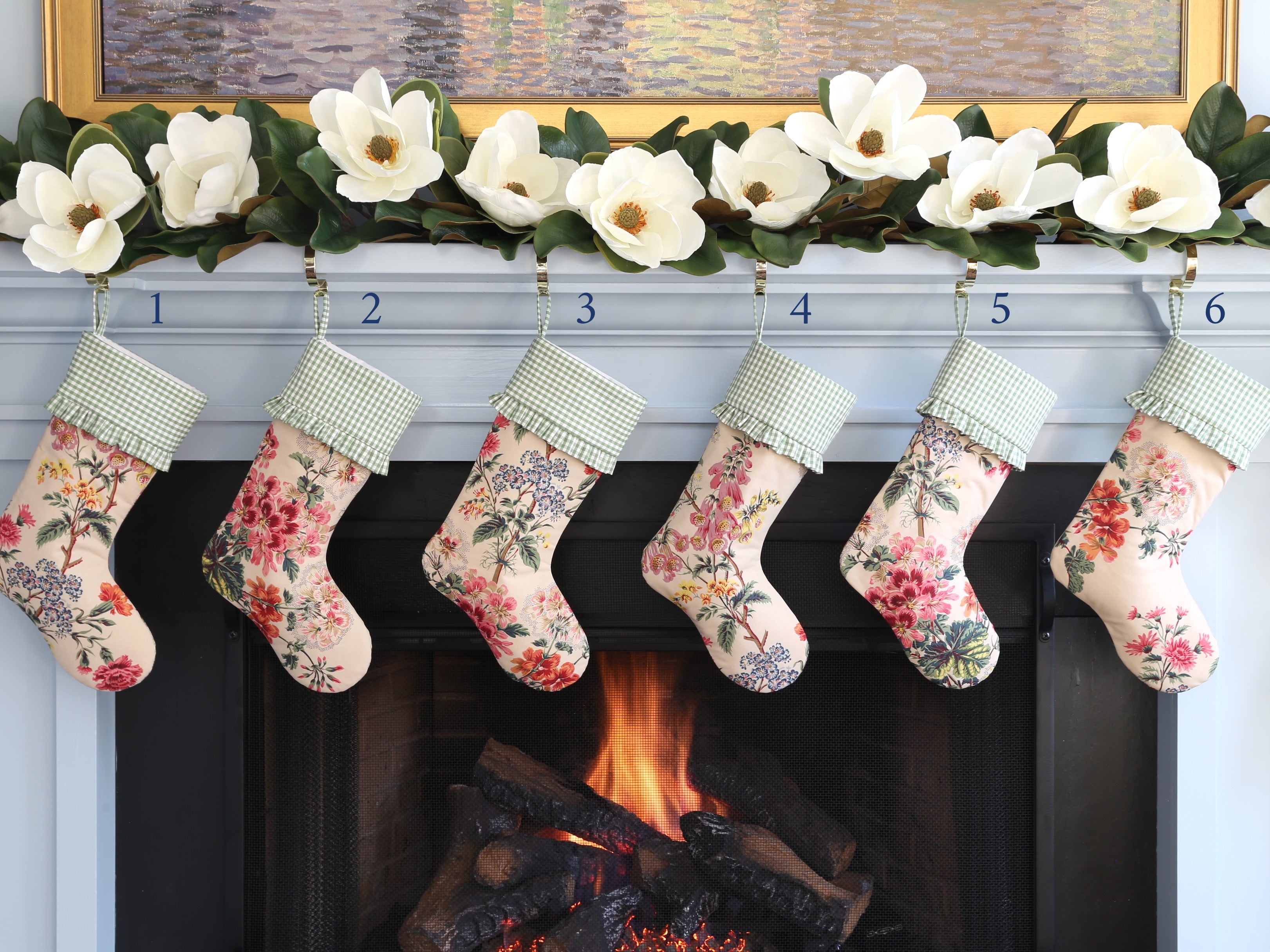 Each unique stocking is cut to show off a different portion of the charming Palmyre pattern, which celebrates the beauty of a cottage garden.