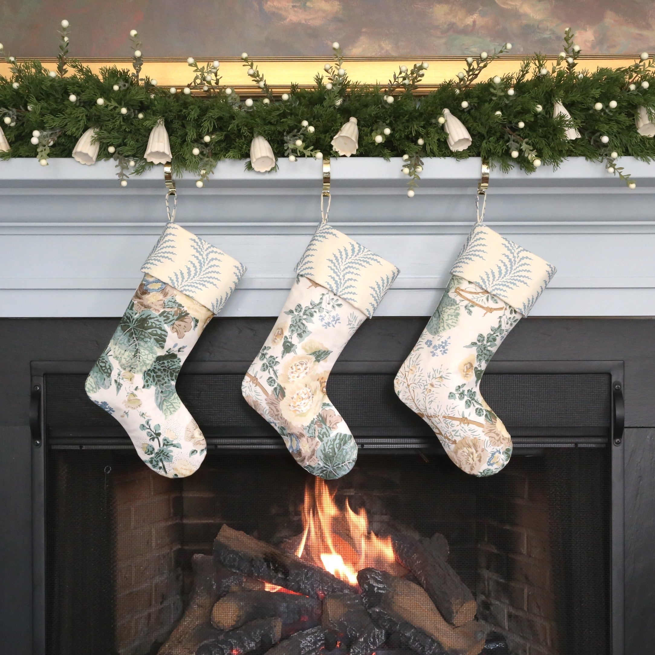 There are 3 stockings available in this fabric combo, each cut to reveal a unique portion of the beautiful Althea pattern.